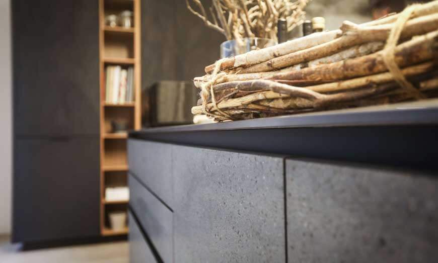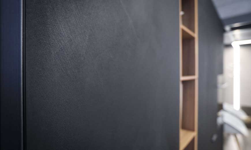 La lava è stata scelta le ante delle basi. L’argilla, con la sua inconfondibile concretezza e la sua capacità di richiamare il concetto di terra, riveste invece le ante delle colonne.