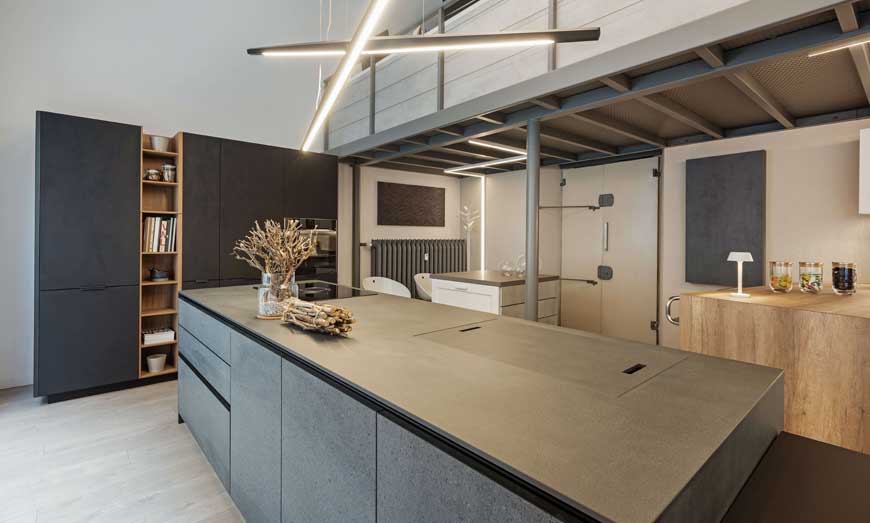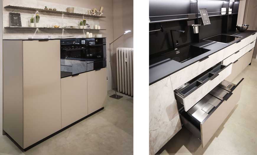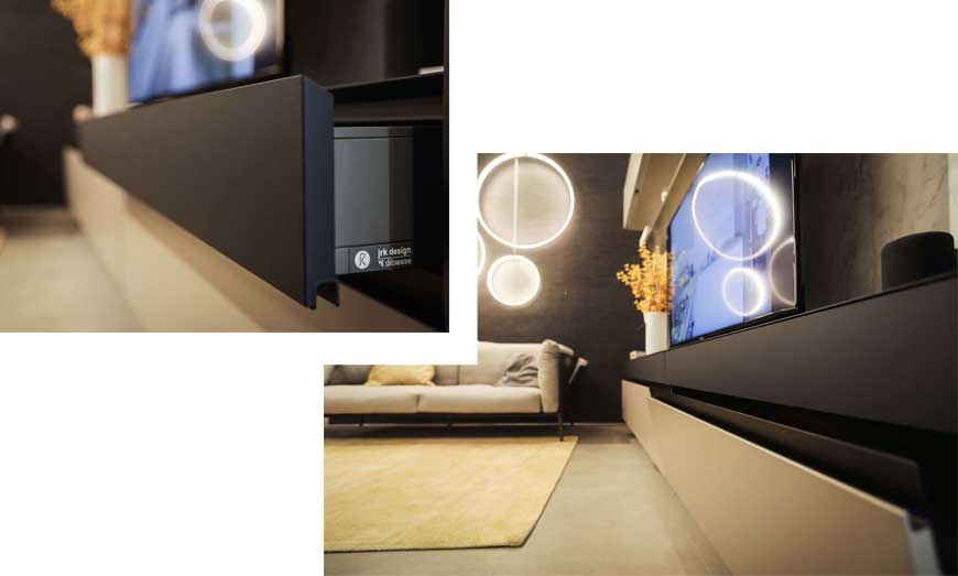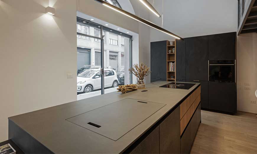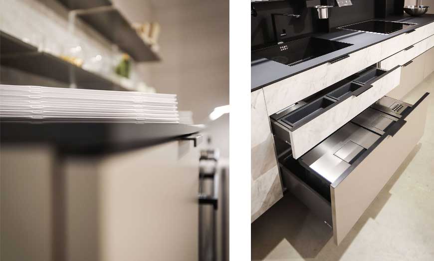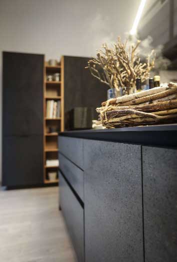 Al Salone del Mobile abbiamo presentato una novità anche per la zona giorno unendo due modelli in esclusiva. Le Basi DJ (doppia Job) sono state realizzate con il primo frontale in Area 22 finitura Fenix NTM nero con bordo superiore tagliato a 30°, per combinarsi al piano in HPL in Fenix NTM colore nero con bordo obliquo.