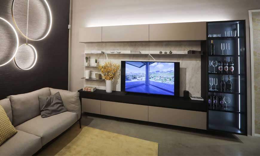Il cassetto inferiore invece è realizzato come Spring Job in finitura metallica, così da rendere il piano quasi invisibile e soprattutto estremamente elegante. Elegantissima è anche la vetrinetta Doha sospesa, con vetro fumè trasparente e illuminato dall’interno da due lame di luci a led integrate alla scocca.