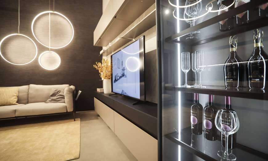 Le luci completano l’atmosfera: sia quelle all’interno della vetrina Doha, con telaio e ripiani interni anodizzato nero e vetro grigio fumè, sia quelle scelte per arredare la parete dietro il divano. I colori abbinati sono il grigio perla satin e il Fenix NTM.